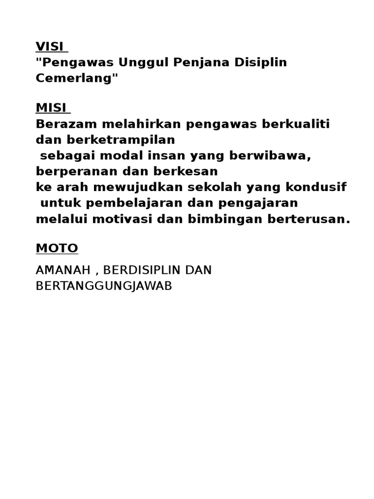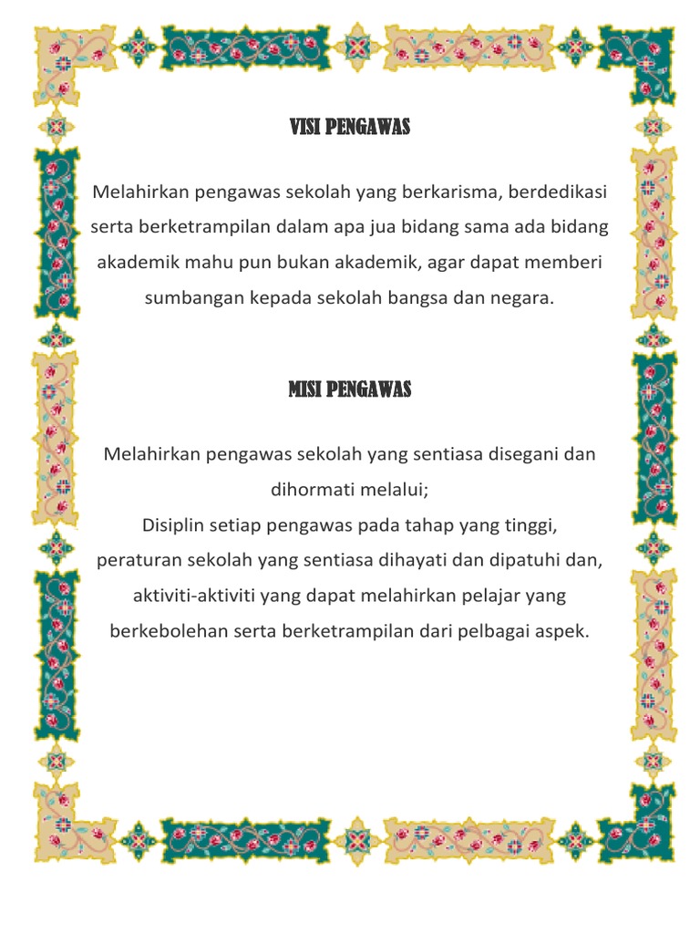 TERWUJUDNYA PESERTA DIDIK YANG BERIMAN CERDAS TERAMPIL MANDIRI DAN BERWAWASAN GLOBAL Misi. Demi mendukung tercapainya Visi Misi dan tujuan sekolah maka perlu diatur dalam surat keputusan kepala sekolah. Program ini merupakan rangkaian dari kegiatan pengawas sekolah yang akan dilaksanakan selama tahun pelajaran 20132014 dengan sistematika sebagai berikut.